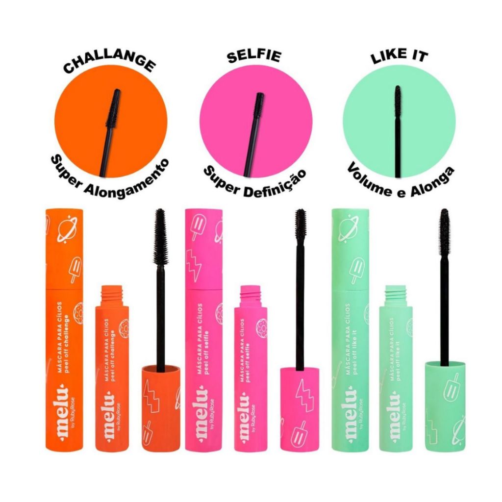 Máscara de cílios Peel off Melu By Ruby Rose, tem 3 diferentes tipos de aplicador, cada um com sua poderosa ação, proporcionando fios do jeitinho que você ama!!!